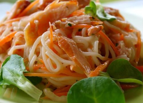 Ajoutez la carotte râpée, le poulet émincé, le sésame et le persil. Mélangez puis réservez 30 min au frais. Au moment de servir ajoutez des feuilles de mâche.