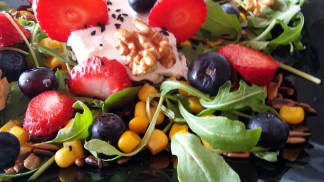 Une salade minceur de fruits, légumes et fromage.
