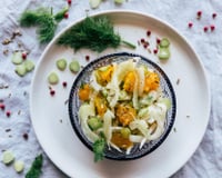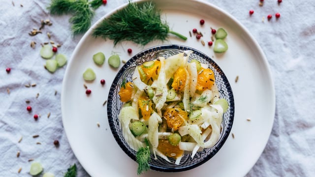 Vous cherchez une recette rafraîchissante pour le déjeuner ou le dîner ? Cette salade de fenouil et à l'orange a beaucoup de goût. En effet, le mélange original de ces deux ingrédients va bluffer tous vos invités ou votre famille ! Pour donner encore plus de saveur à votre salade de fenouil, vous allez rajouter du persil frais et des morceaux d'oignon rouge. Lors du dressage, offrez une touche méditerranéenne à votre entrée. Pour y parvenir, vous allez rajouter quelques olives noires dans votre salade de fenouil. Enfin, pour plus de convivialité, vous pouvez remplacer le gros saladier par des petites verrines. À la dernière minute, rajoutez quelques plumets de fenouil sur votre salade de fenouil et d'agrumes. C'est délicieux !