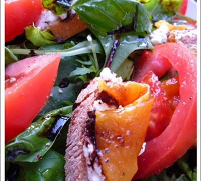 Une salade aux croutons de chèvre frais et poivrons marinés.