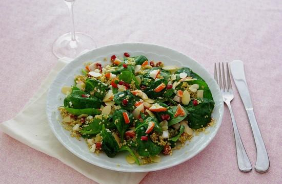 Dans un saladier mélanger les épinards, les grains de grenade, la feta émiettée, le quinoa refroidi et les amandes.