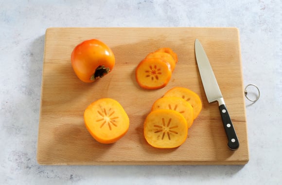 5Lavez les Kakis Ribera del Xuquer AOP, coupez-les en tranches pas trop épaisses dans le sens de la largeur, sans les éplucher.