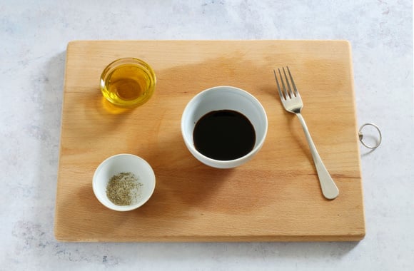 4Préparez la vinaigrette en mettant d'abord le vinaigre balsamique et le sel dans un bol. Ajoutez l'huile d'olive et le poivre, émulsionnez le tout avec une fourchette.