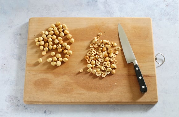 2Epluchez les noisettes torréfiées en les frottant rapidement avec du papier absorbant entre vos mains. Ensuite concassez-les grossièrement à l'aide d'un grand couteau.