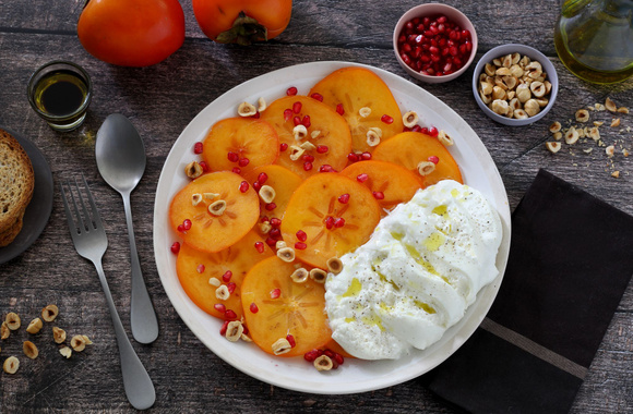 6Disposez joliment les tranches de Kakis Ribera del Xuquer AOP sur une grande assiette plate. Ajoutez la burrata coupée en tranches. Salez, poivrez et assaisonnez avec la vinaigrette. Parsemez les Kakis Ribera del Xuquer AOP de graines de grenade et noisettes concassées.