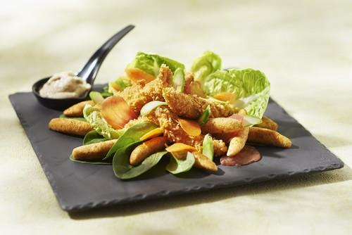 Effeuillez la sucrine et la laver abondamment à l'eau vinaigrée avec les pousses d'épinard. A l'aide d'un économe, réaliser des pétales de carotte et d'asperge verte. Emincez les tomates en fines lamelles. Sur une belle ardoise, disposez les pousses d'épinard, la sucrine. Posez harmonieusement les pétales de légumes puis les mini quenelles et le poulet frit.