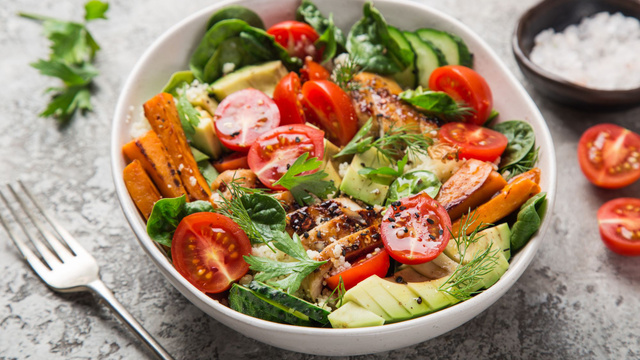 On aime cette salade complète que l’on peut préparer en mode Batch Cooking pour les repas de la rentrée. Le poulet peut se griller à l’avance, tout comme la patate douce. Il suffit d’ajouter du couscous cuit au dernier moment puis des crudités coupées minute. L’avocat est là juste pour les gourmands.