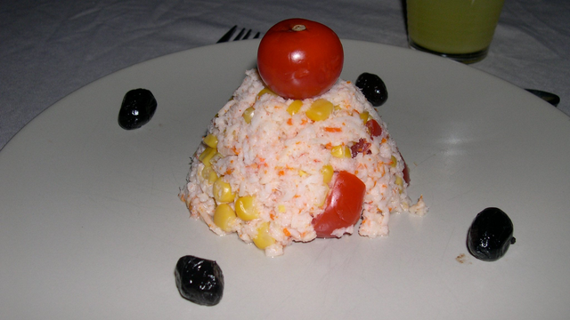 Mélanger tous les ingrédients, assaisonnés avec un peu de mayonnaise et moulé la préparation dans un petit bol rond.