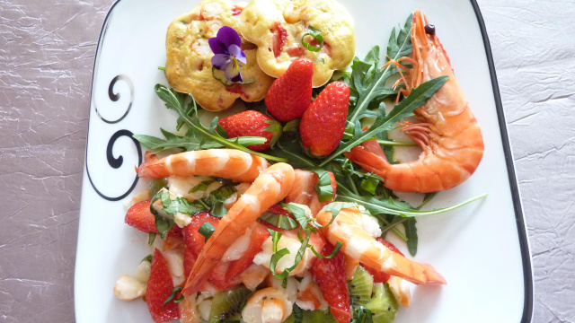 Nettoyez les crevettes. Gardez en 4 pour le décor. Coupez les en tronçons. Pressez le jus d'orange. Nettoyez le basilic et ciselez le. Nettoyez les fraises et coupez les en moitié. Epluchez les kiwis et coupez les en cubes. Faire une vinaigrette avec le jus d'orange et l'huile d'argan. Salez et poivrez. Bien remuer la salade et mettre au frais au moins 1 heure avant de consommer.