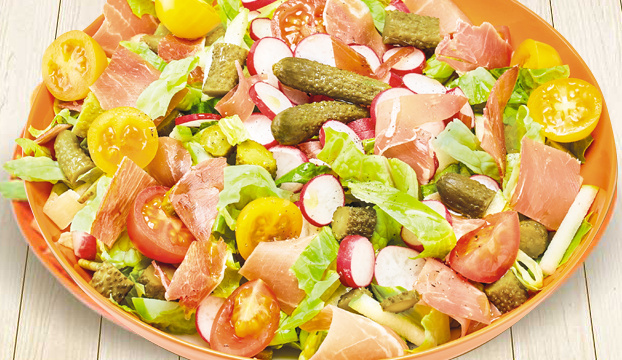 Coupez les tranches de jambon de parme, la salade, les petites tomates et les radis. Placez le tout dans un saladier.