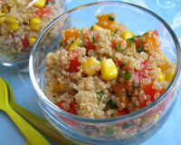 Dans un saladier mélanger le quinoa avec les poivrons pelés taillés en dés et le maïs. Arroser d'huile et de vinaigre. Saler et poivrer.