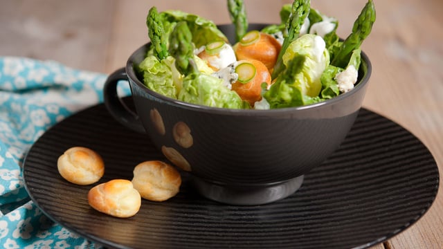 Une salade pour un pique nique? Quoi de plus sympa?Des asperges, donc, de la salade et une crème très parfumée. des petits choux en guise de pain!Quand il n'y a plus d'asperges, on peut mettre des haricots verts frais.