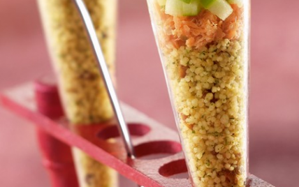 Dans des verrines, disposez un fond de Céréales Méditerranéennes, le saumon émietté à la fourchette, les dés de pomme verte. Arrosez de jus de citron et d'huile d'olive. - 3
