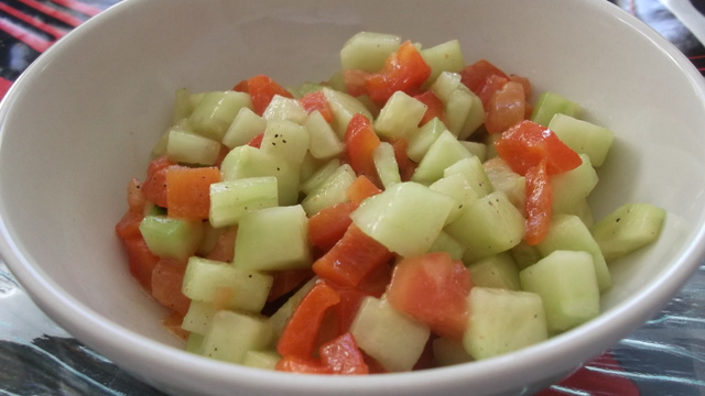 Taillez le poivron en petits cubes, faites de même pour le concombre et les tomates.