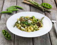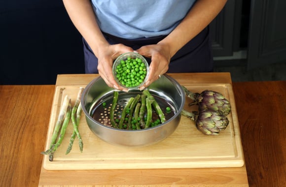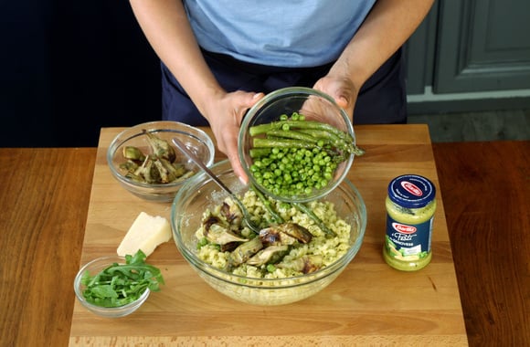 9Ajoutez les artichauts, les petits pois et les asperges puis mélangez délicatement.