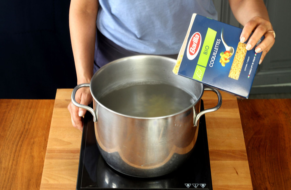 Dès que l'eau bout, versez-y les pâtes et remuez avec une cuillère en bois. Faites-les cuire selon le temps de cuisson indiqué sur le paquet.