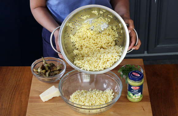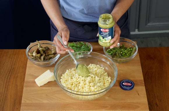 8Assaisonnez immédiatement avec le pesto alla genovese et mélangez.