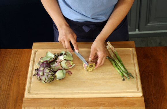 4Cassez les tiges des artichauts, éliminez les grosses feuilles du bas et parez les extrémités. A l'aide d'un couteau, éliminez le surplus de feuilles pour ne garder que les plus tendres.