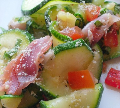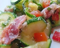 Mélangez courgettes, tomates, basilic et jambon, poivrez généreusement et ajoutez le parmesan.