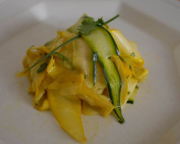 - A l'aide d'un épluche légume, détailler les courgettes dans la longueur avec la peau ainsi que la carotte.Avec l'économe faire des lamelles de zeste de citron et de gingembre frais. Les couper en minuscules morceaux et les incorporer avec le soja dans la vinaigrette.