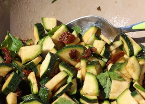 Vous aimez les courgettes et vous voulez les cuisiner impérativement pour le repas du midi ou ce soir ? Cette recette de salade de courgettes va pouvoir vous dépanner quand vous manquez d'inspiration ou de temps. Tout d'abord, vous allez parfumer cette salade avec une vinaigrette maison. Ensuite, pour donner encore plus de saveur à cette salade de courgettes, vous allez relever son goût avec un peu d'échalote. Enfin, vous allez mélanger vos courgettes crues avec des petits morceaux de tomates séchées. Si vous en avez, vous pouvez également rajouter d'autres légumes du soleil tels que des aubergines grillées ou des poivrons verts, rouges ou jaunes. Lors d'un barbecue, vous pouvez proposer cette salade de courgettes à vos invités en guise d'entrée ou bien en accompagnement. C'est un délice !