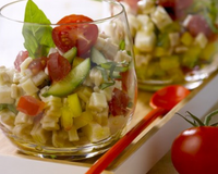 Mélangez délicatement les ingrédients et la vinaigrette dans un saladier, puis remplissez 4 verres de cette salade. Ajoutez sur le dessus les tomates cerise coupées en deux, les feuilles de basilic et servez à température ambiante.