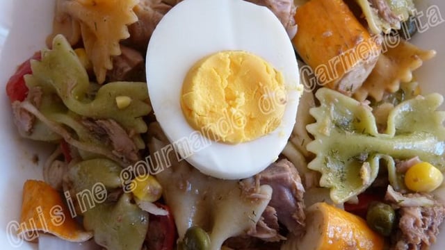 Faire cuire les pâtes « Al dente » comme indiqué sur le paquet, égoutter et laisser refroidir. Dans une casserole remplie d'eau, faire cuire les œufs 10 min. Les passer sous l'eau froide et les écaler.