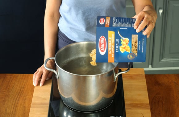 Dès que l'eau bout à gros bouillon, versez-y les pâtes et remuez avec une cuillère en bois. Faites-les cuire selon le temps de cuisson indiqué sur le paquet.