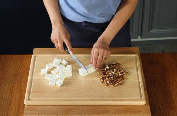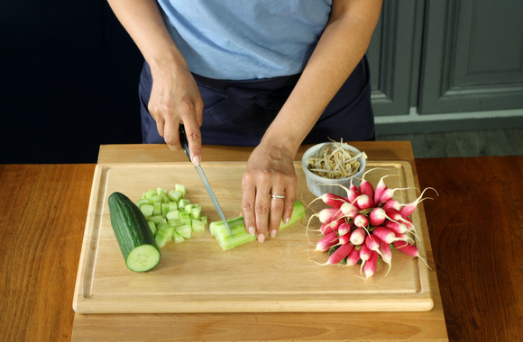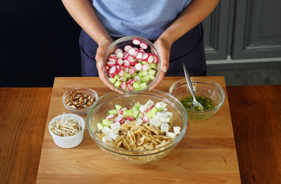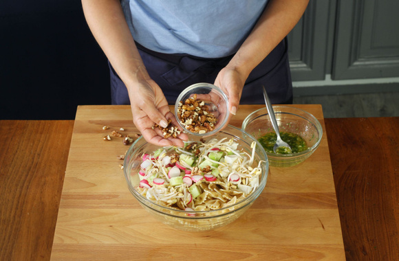 8Ajoutez aux pâtes refroidies les dés de concombre, les rondelles de radis, les pousses de soja et la fêta. Remuez.