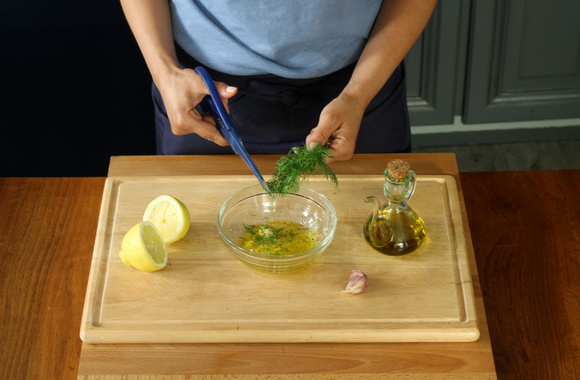 7Dans un bol, mettez l'ail haché, le jus et zeste de citron, l'huile d'olive et l'aneth ciselé. Salez et poivrez puis mélangez soigneusement.