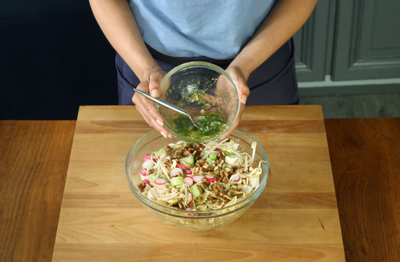 10Terminez en versant la sauce au citron sur les pâtes. Mélangez et gardez au frais avant de servir.