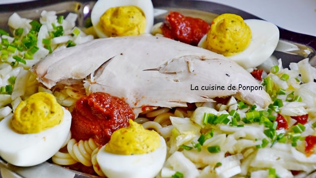 Dans un plat de service, disposer les pâtes cuites et refroidies au milieu, sur les côtés la salade de fenouil parsemée de ciboulette ciselée. Déposer le filet de pintade par dessus. Garnir avec les oeufs durs farcis et le ketchup. Servir avec quelques petits pains.