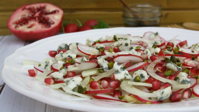 Egouttez le fenouil, séchez-le et dressez le plat en mélangeant les légumes. Emiettez le roquefort et ajoutez-le au plat. Saupoudrez de pistaches concassées. Ajoutez la vinaigrette au dernier moment ou servez-la à part afin de garder à la salade sa couleur et son croquant jusqu'au moment de la dégustation.