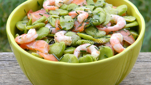 Versez les fèves froides dans un saladier. Ajoutez les crevettes , le saumon fumé taillé en lanières, l'huile d'olive, le jus de citron et la ciboulette. Salez, poivrez. Mélangez le tout. Servez frais.