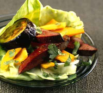 - 2Dans 4 assiettes de service, dresser les feuilles de chou.Couper les carottes en lamelles épaisses dans le sens de la longueur.