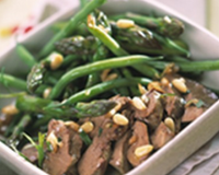 Mélanger les harocots verts et les pointes d'asperges à la vinaigrette. Dresser en dôme sur 4 assiettes. Egoutter les foies de lapin, les émincer et les disposer autour du dôme. - 3
