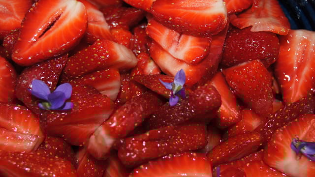 Équeuter puis couper en lamelles les fraises dans un saladier de service, les saupoudrer de sucre mélanger puis parsemer de violettes