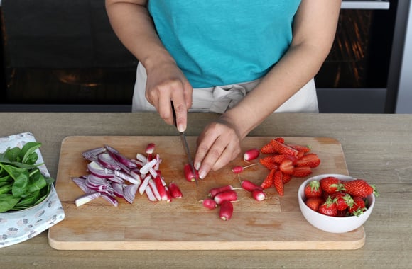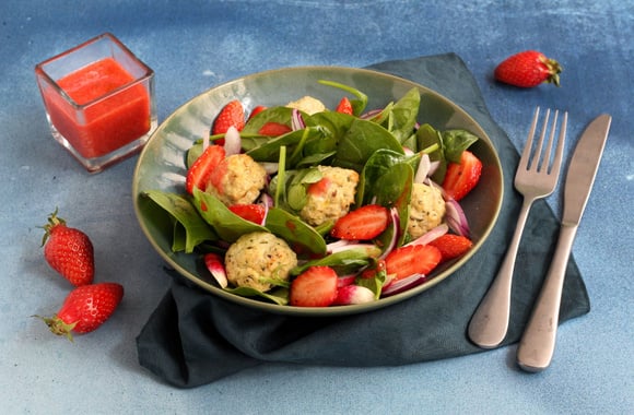 11Mettez les pousses d’épinards et les lamelles d'oignon dans un saladier. Ajoutez les Fraises du Périgord IGP restantes, les radis et les boulettes.