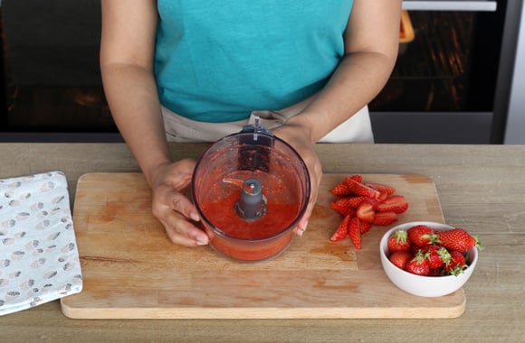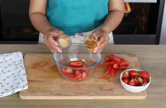 8Dans un bol, faites mariner la moitié des Fraises du Périgord IGP avec le sucre et le vinaigre pendant 10 minutes.
