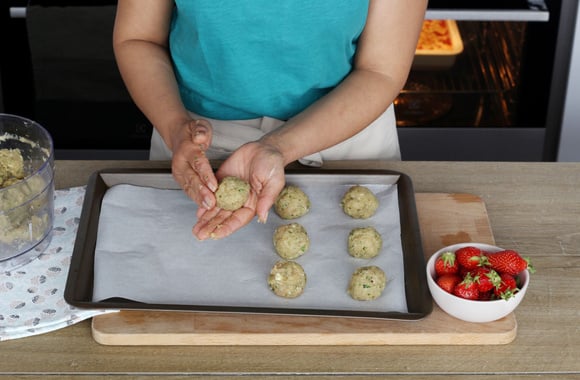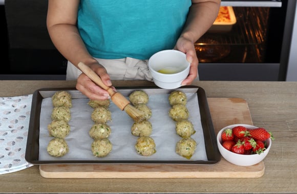 6Placez une feuille de papier sulfurisé sur une plaque allant au four. Disposez dessus les boulettes, badigeonnez-les d’huile d’olive à l’aide d’un pinceau, enfournez-les et faites-les cuire pendant 10 minutes.