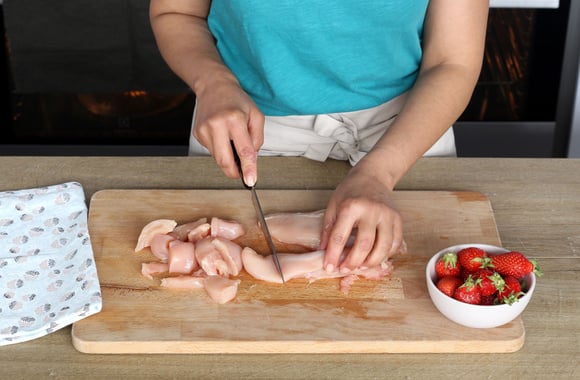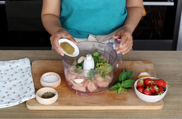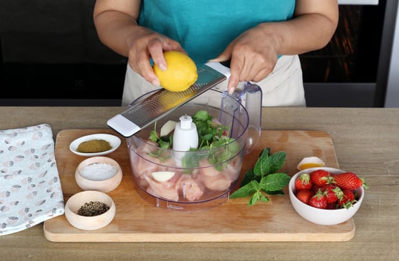 2Dans un hachoir, mettez les dés de poulet, la menthe, le persil et le zeste de citron.