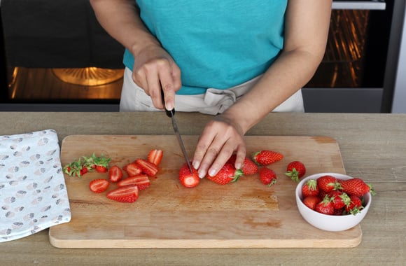 7Rincez, équeutez et coupez les Fraises du Périgord IGP en deux.
