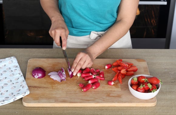 10Épluchez l’oignon et coupez-le en lamelles, coupez le radis en quatre.