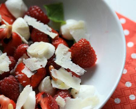 Voilà une recette avec les fraises mais en version salée . Elles s'harmonisent avec les framboises parfaitement bien avec la mozza et le parmesan