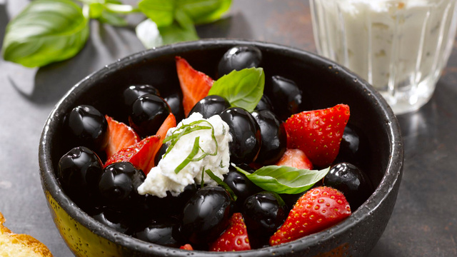Salade de fraises, olives noires confites, crème fouettée à l"huile d"olive et basilic