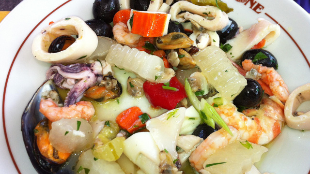 Plongez les calamars ,les crevettes et les petits poulpes dans l'eau bouillante.