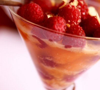 Dans un verre à cocktail, alterner une couche de framboises, puis de billes de melon, et enfin de framboises.