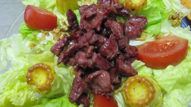 Une salade composée idéale pour le soir : Laitue gésiers et faux cannelés gourmands.