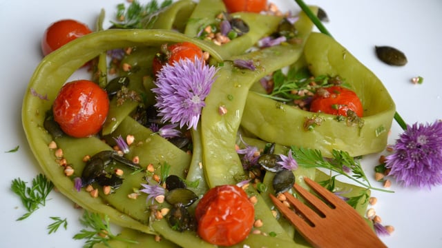 Avant de dresser les assiettes, s'assurer que tous les ingrédients sont bien froids. Déposer quelques haricots dans chaque assiette, 5 tomates cerises rôties par personne, saupoudrer de graines de kasha et de courge, de ciboulette et de coriandre émincées, de fleurs de ciboulette et d'oignon rouge. Enfin, assaisonner avec la sauce aillée. Servir de suite ou placer au réfrigérateur jusqu'au service.
