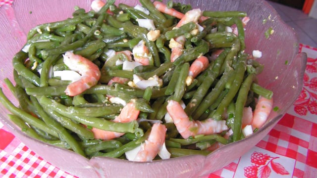 Les mettre dans un plat creux, décortiquer les crevettes et les ajouter aux haricots verts. Ajouter la ciboulette hachée et les feuilles de basilic ciselées. Hacher les œufs durs et les ajouter à la préparation.